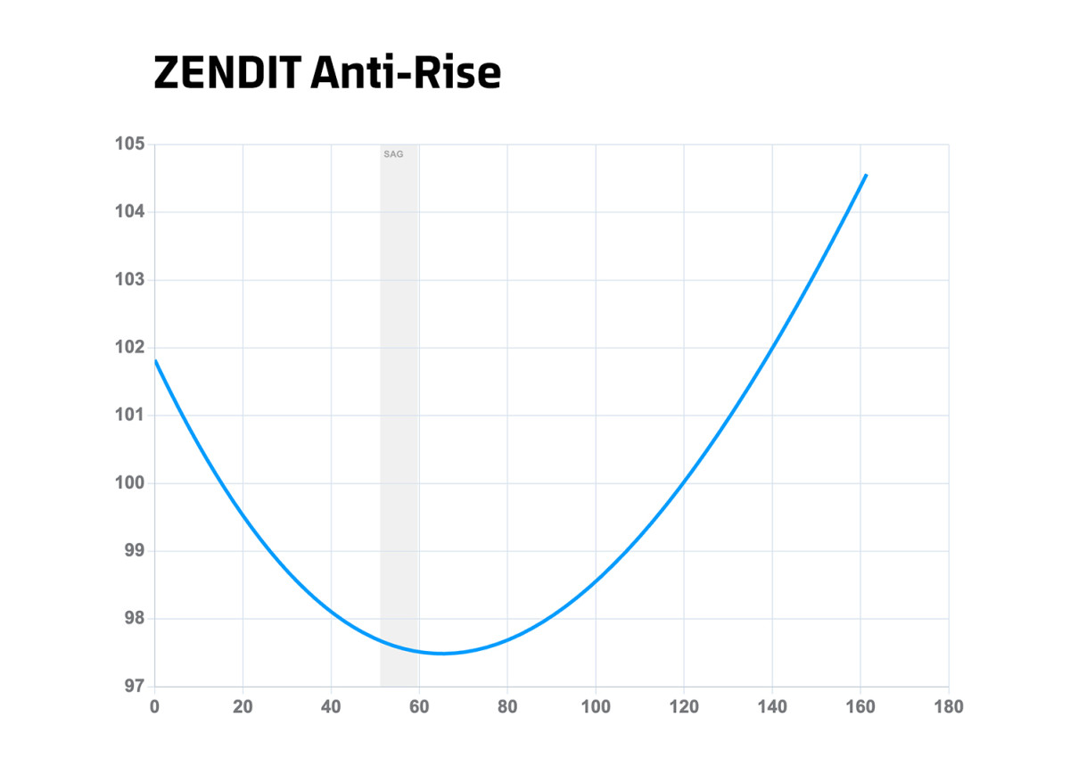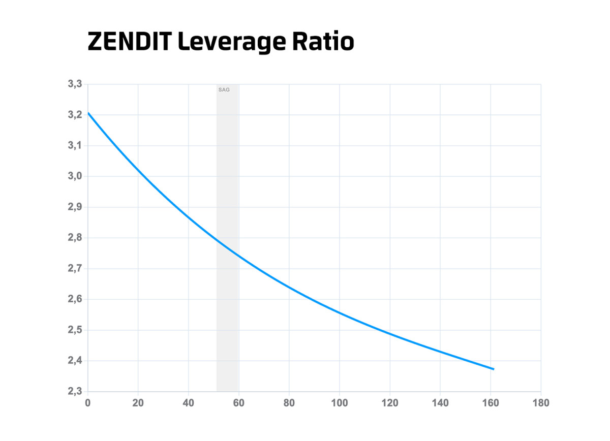ZENDIT anti-rise at sag is approx 99%. This keeps maximum rear wheel traction when braking and the brake force has minimum effect on suspension.